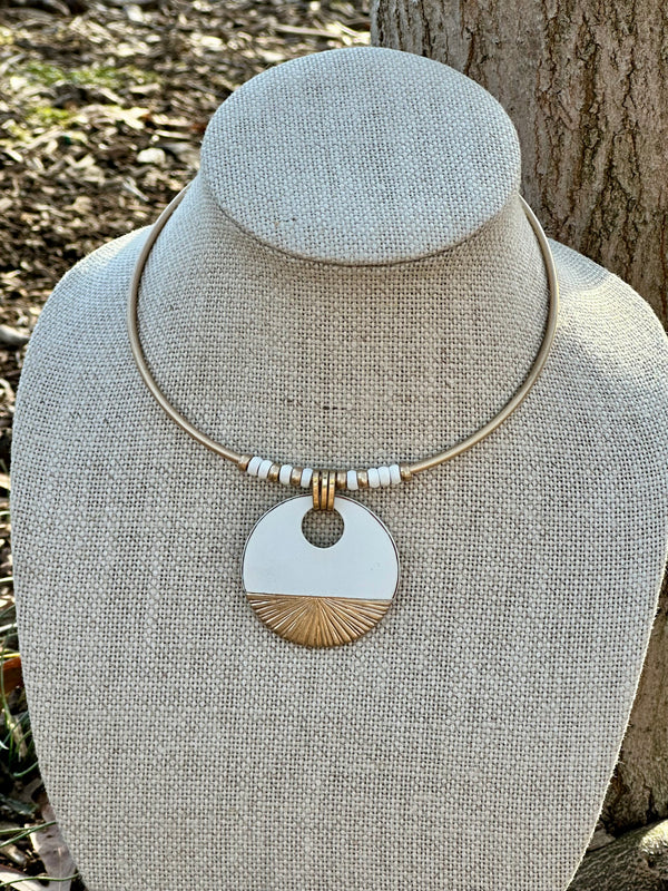 White Patina & Gold Disc Pendant Collar Necklace Gold Tone Mixed Metals Easy Hook Clasp Closure Approximate Measurements: Pendant- Length- 16.5"; Pendant Drop- 2" Be fashionista fabulous in this extraordinary white and gold pendant statement necklace designed by Robert Lee Morris Soho. Arm candy that will have all eyes on...